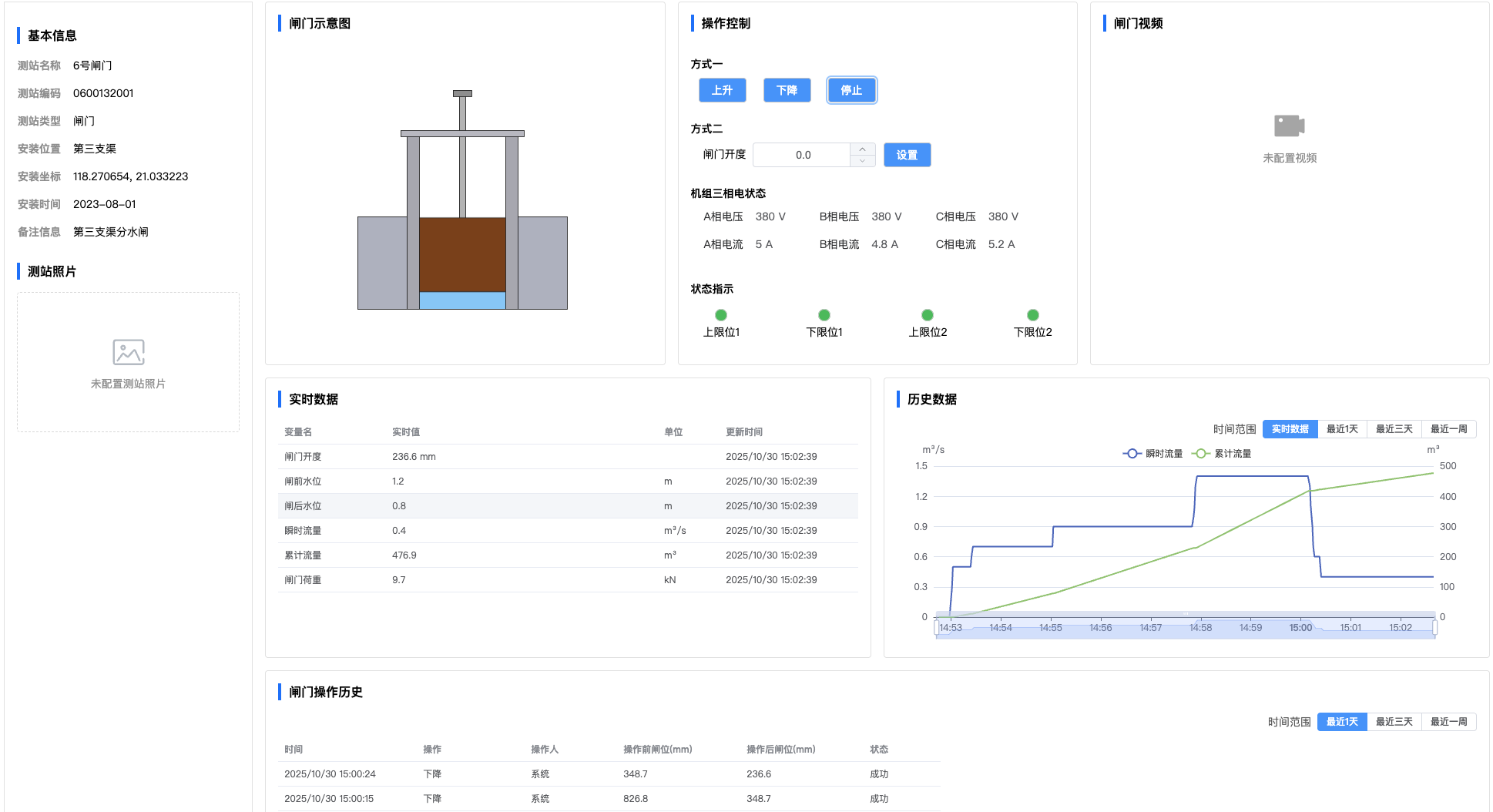 系统支持对闸门和泵站的自动化控制与管理,通过传感器和网关控制器,系统能够实时监测并自动调节水流的分配和控制,并支持限位保护.