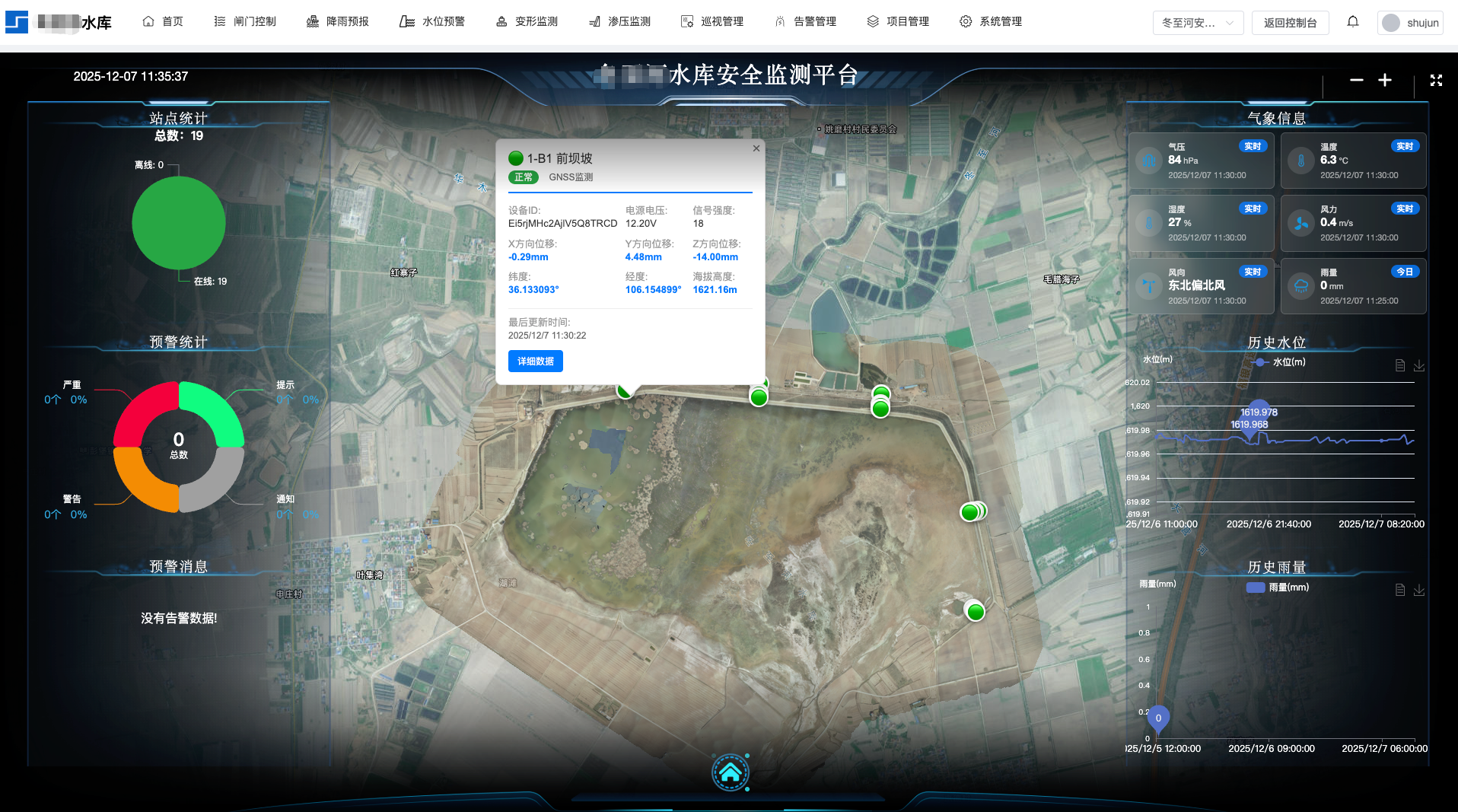 数据会将被整合到一张 GIS 地图上,以直观、清晰的方式展示出各个站点的准确标识、当前状态、实时数据、地理位置、高程等信息,为水库的监控、预警及决策管理提供强有力的可视化支持。